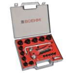 Ce coffret permet la découpe de joints, pastilles ou rondelles jusqu'à 50 mm de diamètre. Les emporte-pièces se verrouillent sur le mandrin très facilement grâce au système d'ergot et peuvent se jumeler pour découper un joint en une seule opération.